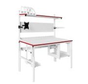 Стол промышленный СП-ТТ изготовлен на базе 2-х стационарных тумб ТС. Данная серия столов используется для организации рабочего процесса, при котором необходимо хранить и использовать большой объем рабочих материалов и комплектующие за рабочим местом. В зависимости от размеров используемых материалов возможно подобрать тумбы с разным количеством ящиков. Тумбы вместе с дополнительным оснащением в виде системы перегородок и маркировки (обозначения ящиков) позволяют организовать хранение материалов на своих местах. Ящики защищают рабочие материалы, инструменты от загрязнения и сохраняют их в исходном состоянии. Тумбы оборудованы центральным замком для индивидуального доступа. Ручки изготовлены из алюминиевого профиля с анодированным покрытием и боковыми пазами для установки обозначения (маркировки) ящиков по их прямому назначению (подразделение организации, документация, инструменты, материалы и т.д.). Столешница промышленного стола СП-ТТ изготовлена из ламинированной ДСП толщиной 25 мм. В качестве дополнительного оснащения данная столешница может иметь оцинкованное или поликарбонатное покрытие, которое позволяет увеличить эксплуатационный ресурс стола и использоваться для организации слесарных и монтажных работ. Стол антистатический, согласно требованиям стандарта ГОСТ IEC 61340-5-1-2019, на лицевой стороне столешницы имеет маркировку — знак ESD (Electrostatic sensitive device), обозначающий работу с материалами, чувствительными к электростатическому разряду. Основу столешницы составляет плита, облицованная HPL ESD пластиком. В комплект поставки антистатического стола входит ESD набор для заземления столешницы — болт и провод с клеммой. Тумбы окрашены антистатической порошковой краской. Т1 - тумба с дверью и 2 полками Т2 - тумба комбинированная с ящиком и дверью (внутренние размеры 1 ящика: 100х400х505 мм (ВхШхГ)) Т3- тумба на 3 ящика (внутренние размеры ящиков: 3 ящика - 200х400х505 мм (ВхШхГ)) Т5 - тумба на 5 ящиков (внутренние размеры ящиков: 4 ящика - 100х400х505 мм, 1 ящик - 160х400х505 мм (ВхШхГ) Высота столешницы — 820 мм. Максимальная распределенная нагрузка на стол — до 300 кг. Цвет металлического каркаса — светло-серый (RAL-7035), возможно покраска в иной цвет. Температурная стойкость столешницы — до 300°С. Промышленное и антистатическое исполнение ESD.